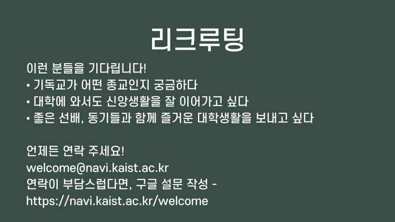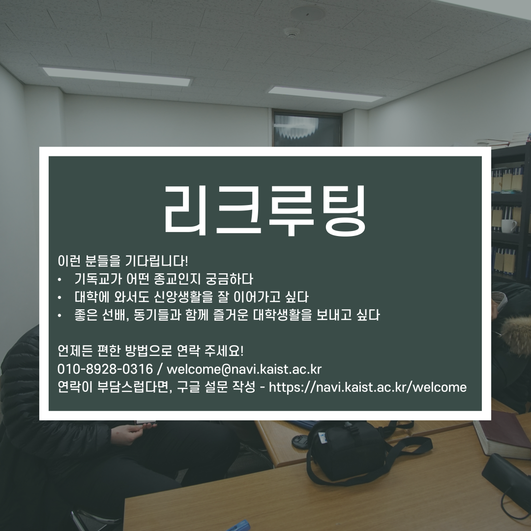 함께 교제하며 즐겁고 경건한 대학생활을 하고 싶은 카이스트 학우 여러분이라면 모두, 항상 환영합니다!