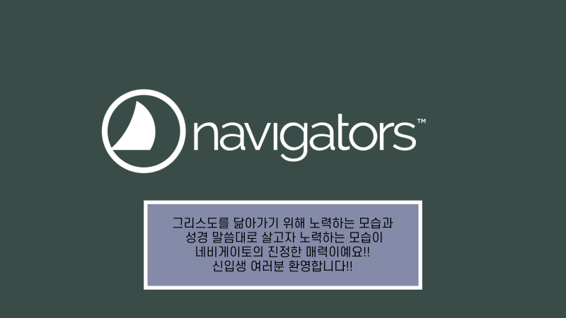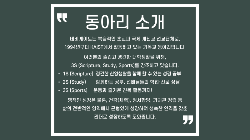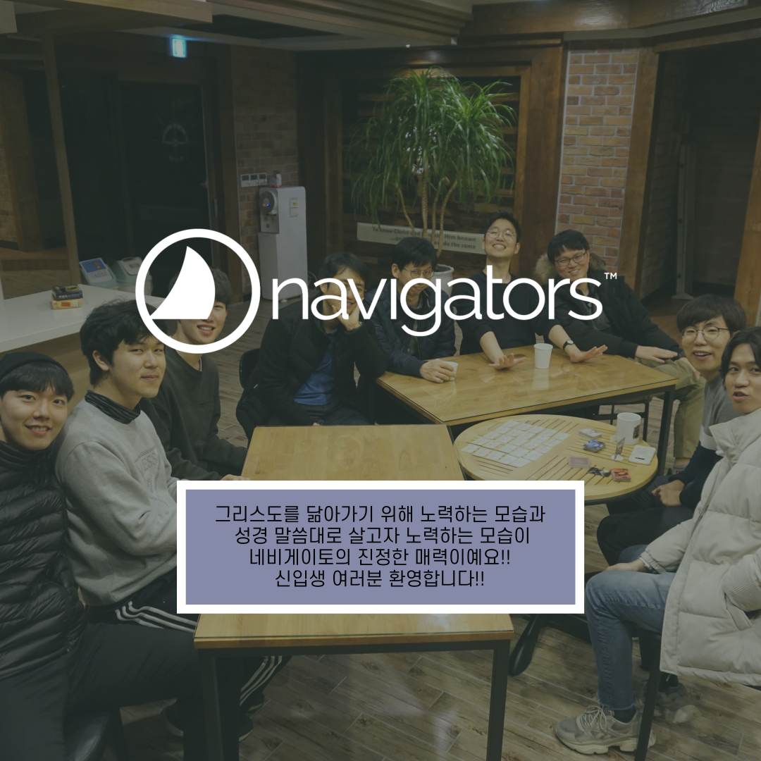 네비게이토는 1994년 2월부터 KAIST의 정식 동아리로서 활동하고 있으며, 카이스트 복음화 협의회에 소속된 국제적이며 복음적인 기독교 동아리입니다. 네비게이토의 활동은 말씀, 기도, 교제, 증거의 기초를 다지며 그리스도 중심의 삶을 살아가기 위해, 성경 중심의 신앙 멘토링과 크리스천 리더십 트레이닝에 초점을 맞추고 있습니다. 또한 이를 기반으로 3S 활동, 곧 말씀(Scripture), 공부(Study), 운동(Sports)을 선후배들과 함께 하고 있습니다. 이외에도 다양한 활동을 통해 즐겁고 경건한 대학생활을 추구하고 있습니다.